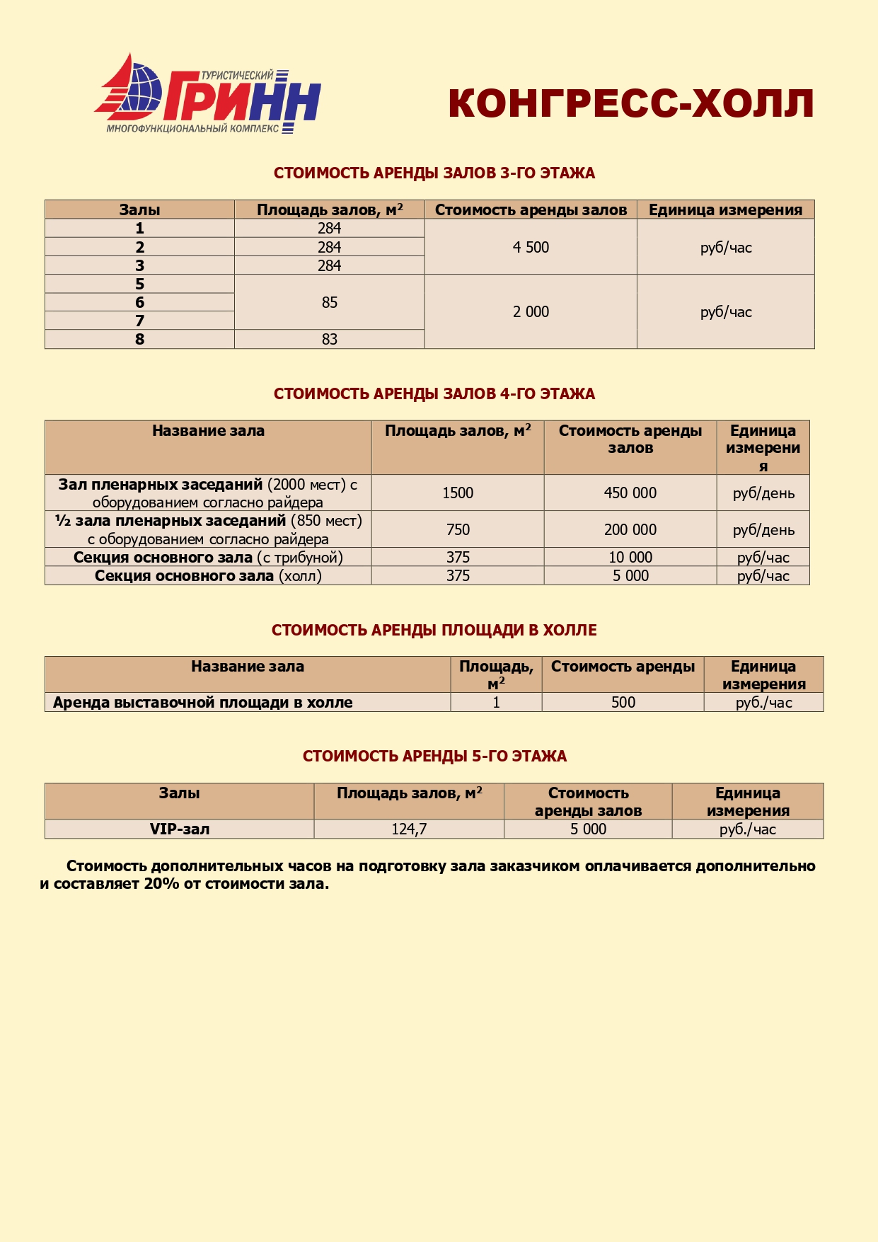 Название зала | Площадь, м² | Стоимость аренды | Единица измерения |