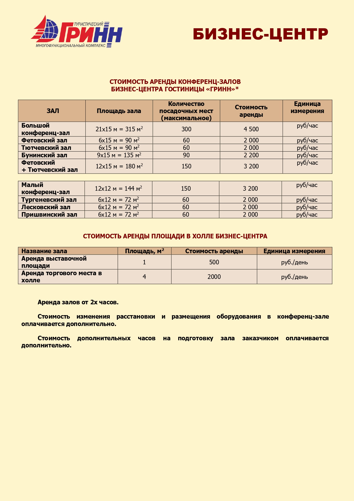 Фетовский зал+Тютчевский зал | 12х15 м = 180 м² | 150 | 3200 |